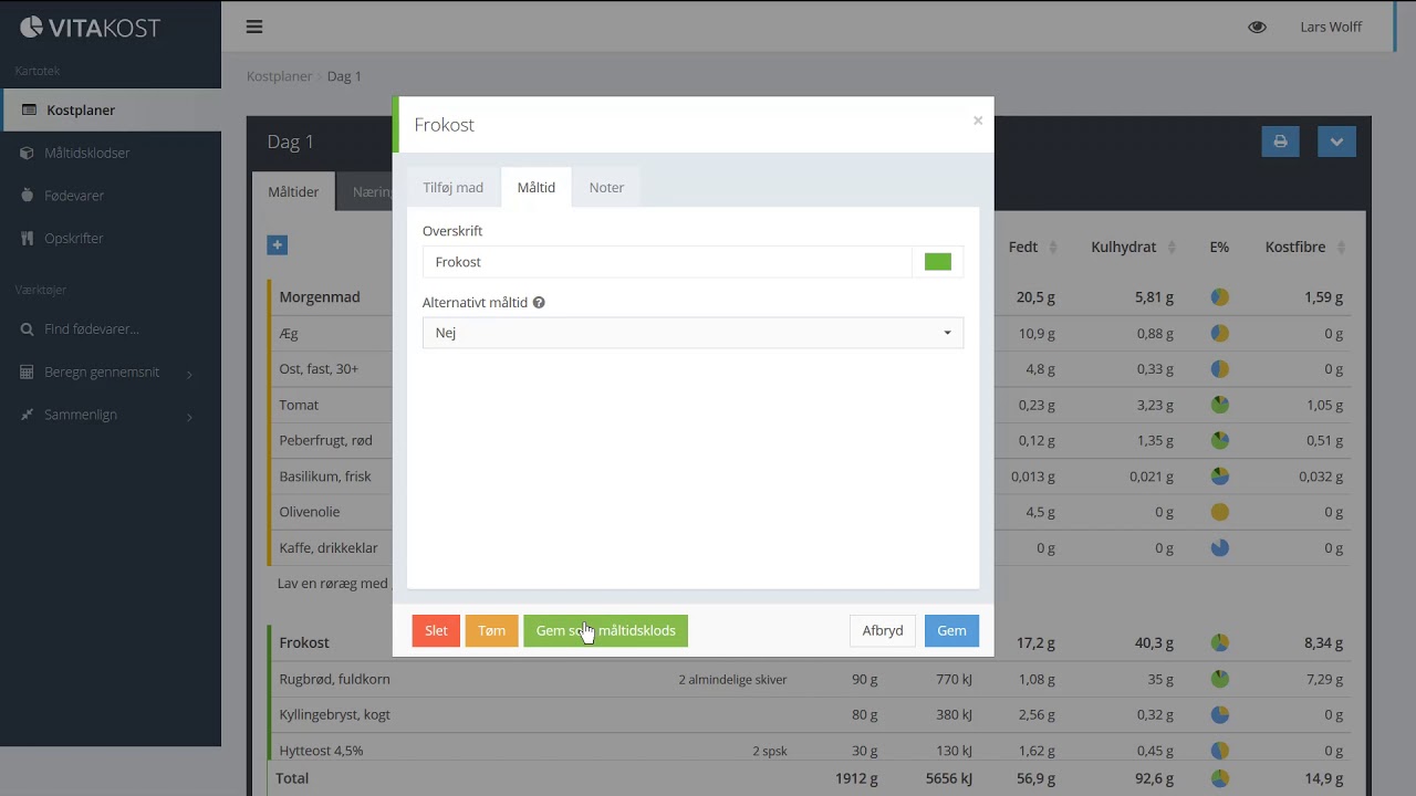 - Klik på knappen "Gem som måltidsklods" nederst i boksen. Måltidsklodsen kan herefter åbnes i et nyt vindue, hvor du kan arbejde videre med den, give den et nyt navn osv.